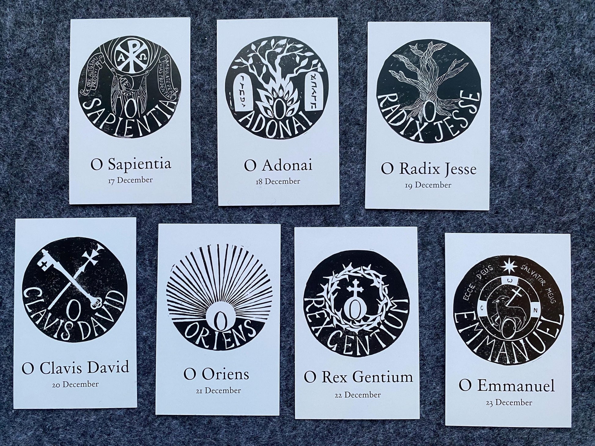 A set of 7 prayer cards featuring high quality reproductions of my original lino prints of the O Antiphons for the last days of Advent.